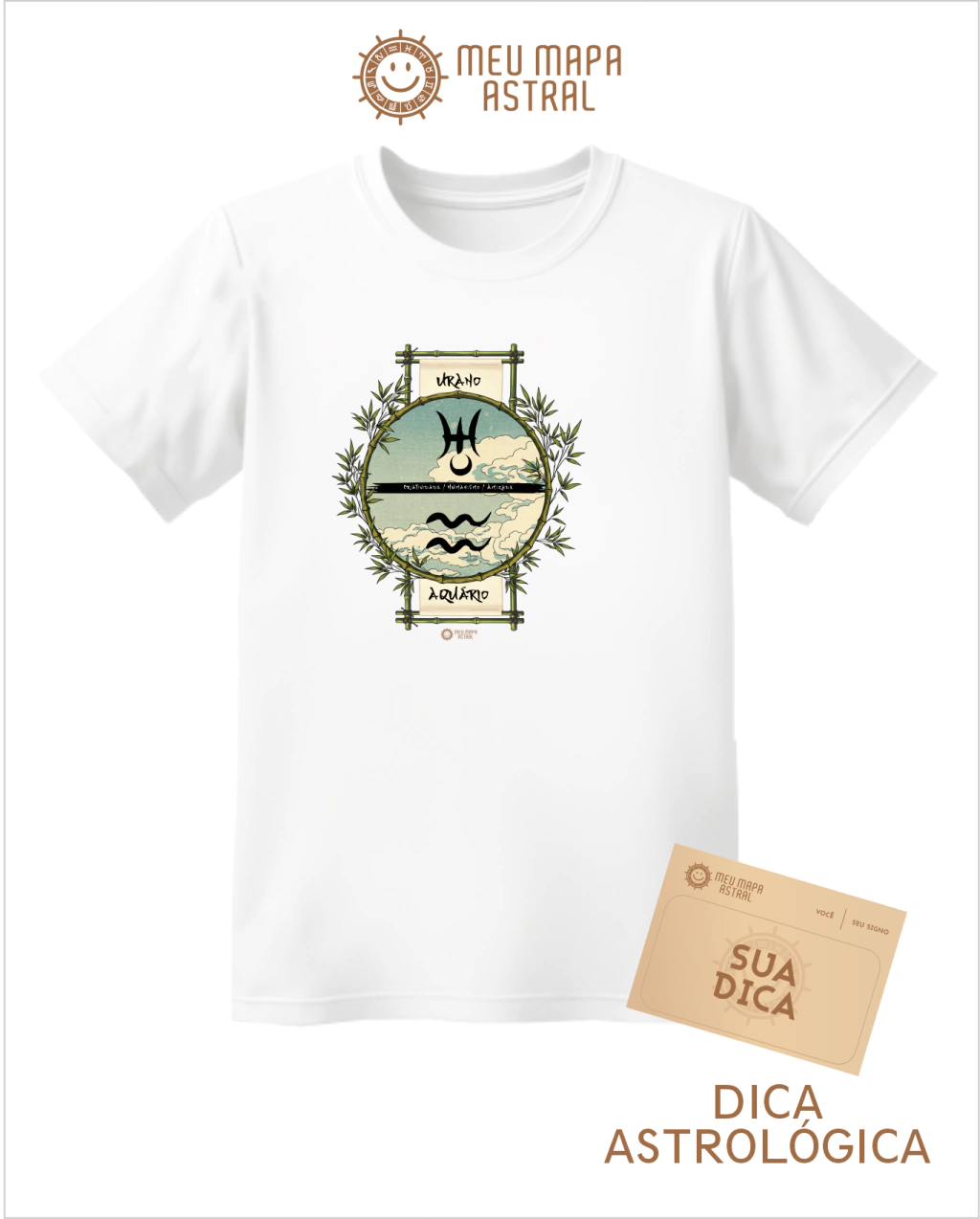Camiseta Aquário/Urano Ilustrada — para quem quer expressar sua essência única e inovadora! Produzida 100% em algodão, essa camiseta une conforto e qualidade com uma estampa astrológica exclusiva que destaca seu signo natal Aquário e o poder do seu astro regente, Urano.