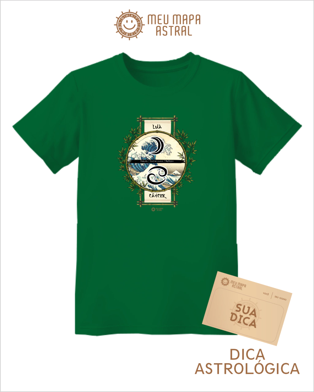 Feita 100% de algodão super confortável, essa camiseta traz seu signo Câncer, seu astro regente Lua e suas características mais marcantes, inspirada no mestre do ukiyo-e, Katsushika Hokusai.