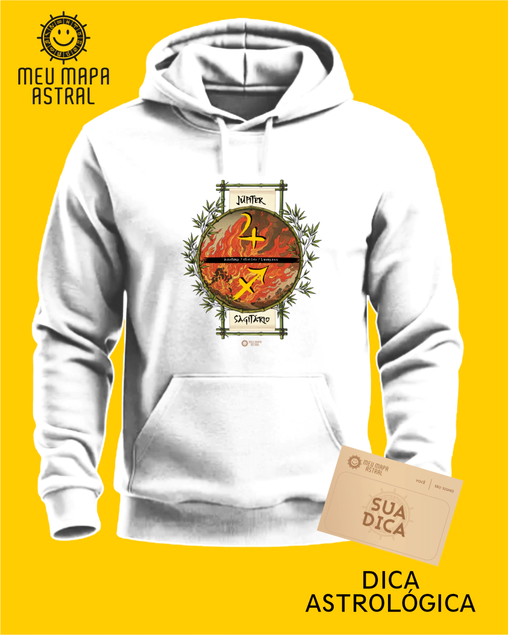 Moletom aconchegante, com aquele toque fofinho e flanelado por dentro, super confortável, em diversas cores, ele traz os símbolos do seu signo Sagitário, seu astro regente Júpiter e suas principais características, numa estampa astrológica inspirada no mestre do ukiyo-e, Katsushika Hokusai, cheia de estilo.